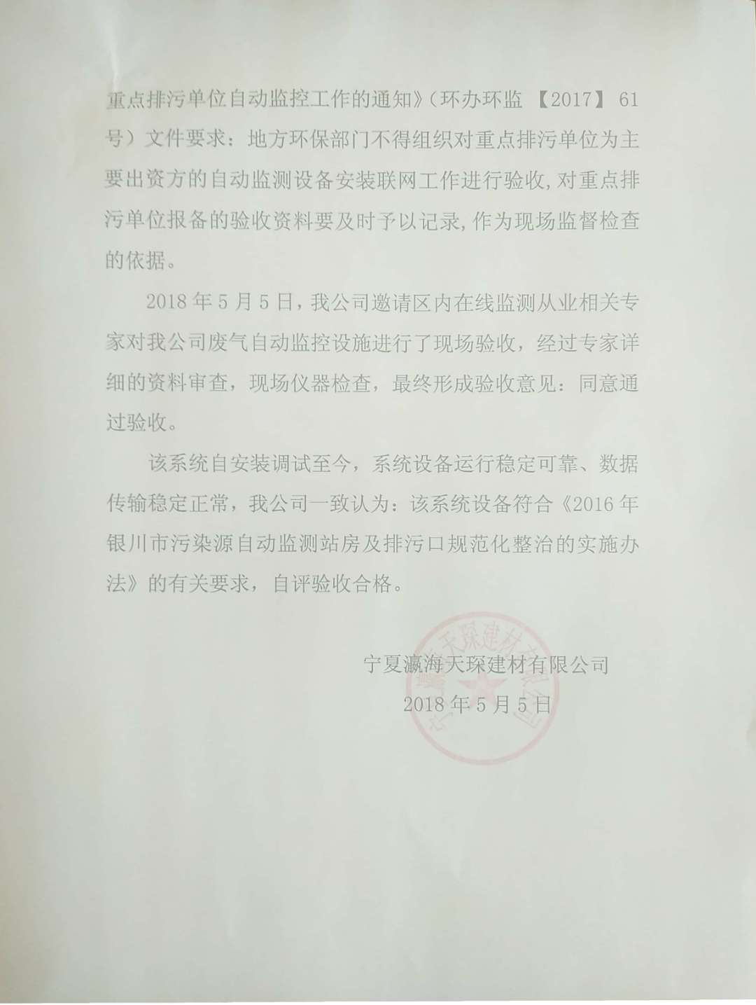 寧夏瀛海天琛建材有限公司廢氣自動(dòng)監(jiān)測(cè)驗(yàn)收自評(píng)報(bào)告